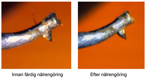 Efter flera kontroller, byte av rem, justeringar av inställningar, rengöring och provspelning kan vi få liv i en skivspelare som inte använts ett tag. Exempelbilden nedan visar nålen före och efter slutförd rengörning. En hel del avlagring och smuts satt fast i diamantens infästning, fortfarande när den såg ren ut vid första anblicken.